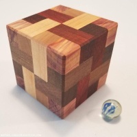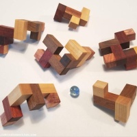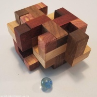 The Exolution III Puzzle is a sliding, interlocking wooden puzzle with a marble inside that complicates the sliding moves available. The 1st objective is to remove the marble from the puzzle. There are 5 moves required in order to free the marble, and unlike the Exolution I & II most of the moves are not the marble moving. The 2nd objective is to disassemble the rest of the puzzle. There are 6 puzzle pieces, one more than version I or II. The final objective is to reassemble the puzzle with the marble inside.
