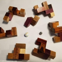 The 1st objective the Exolution puzzles is to remove the marble from the puzzle. There are 6 moves required in order to free the marble. The 2nd objective is to disassemble the rest of the puzzle. There are 7 wooden pieces. The final objective is to reassemble the puzzle with the marble and ball bearing inside.