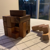 Two puzzles are shown in the picture because the woods are all the same, but the pieces they were used in changes. Six pieces made from Canarywood, African Mahogany, Okoume, Argentine Mesquite and Monterillo Rosewood. Ships unassembled. Moves - 4.4.7.3.2 with 5 Rotations