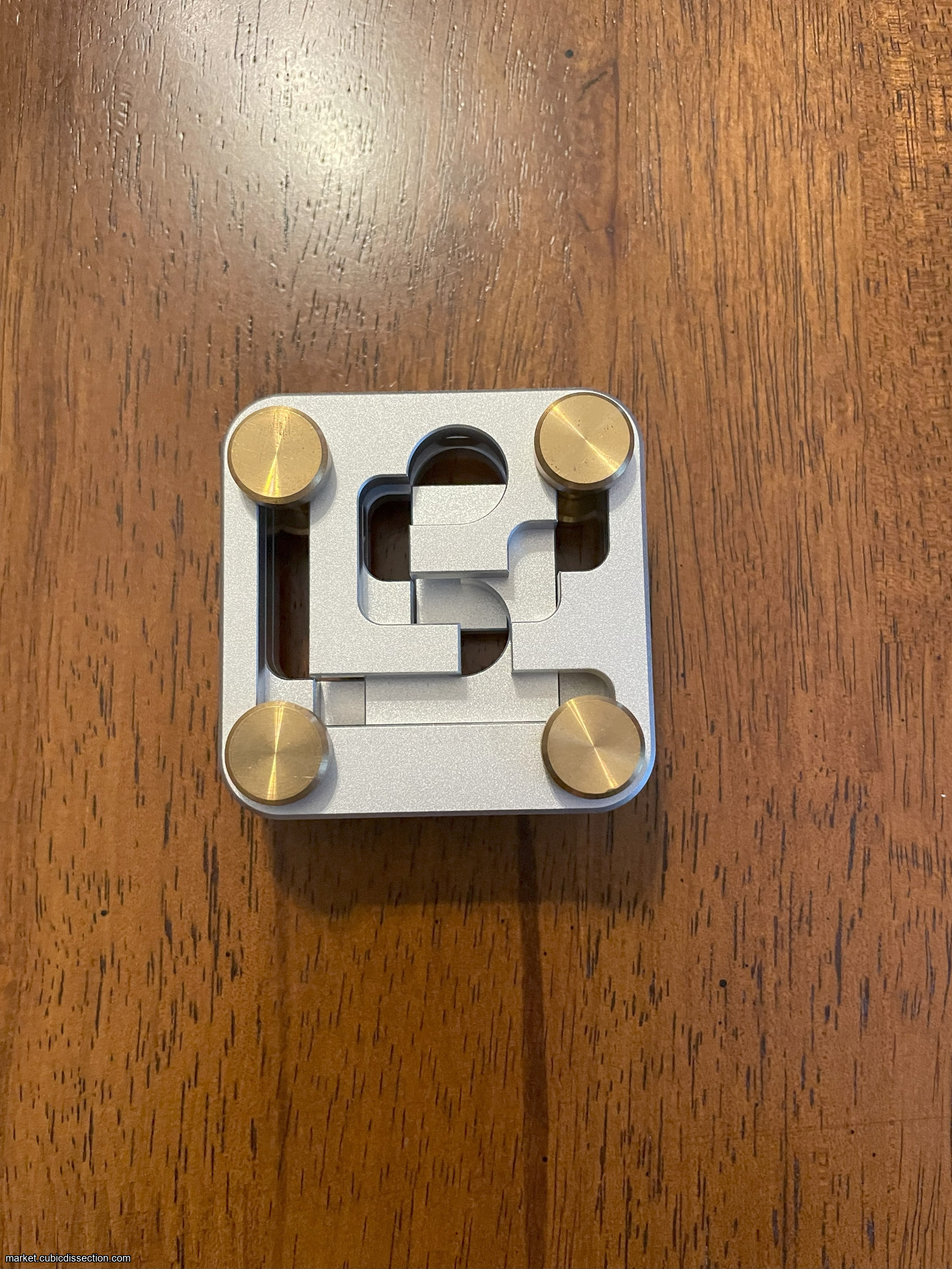 FastMaze 0 is precision crafted from machined aluminum and solid brass. The puzzle does not show any laser cutting marks as cheaper metal puzzles often do. Each piece was custom milled, and the attention to detail is apparent. Every maze edge is micro-chamfered for a smooth feel and easy movement. The plates are finished with fine sandblasting, similar to high-end electronic goods, and are clear anodized which makes them scratch and tarnish resistant. The tight tolerances guarantee smooth movement and make it a joy to pick up and play.