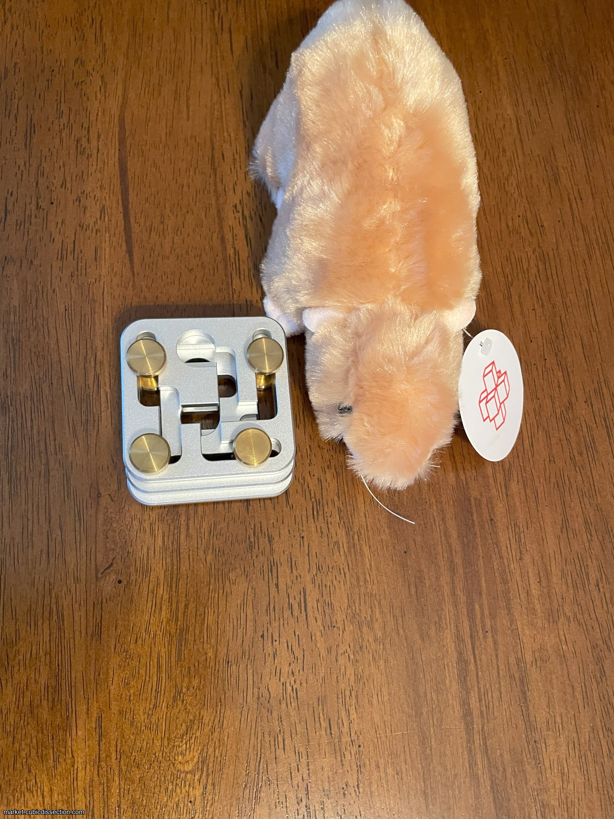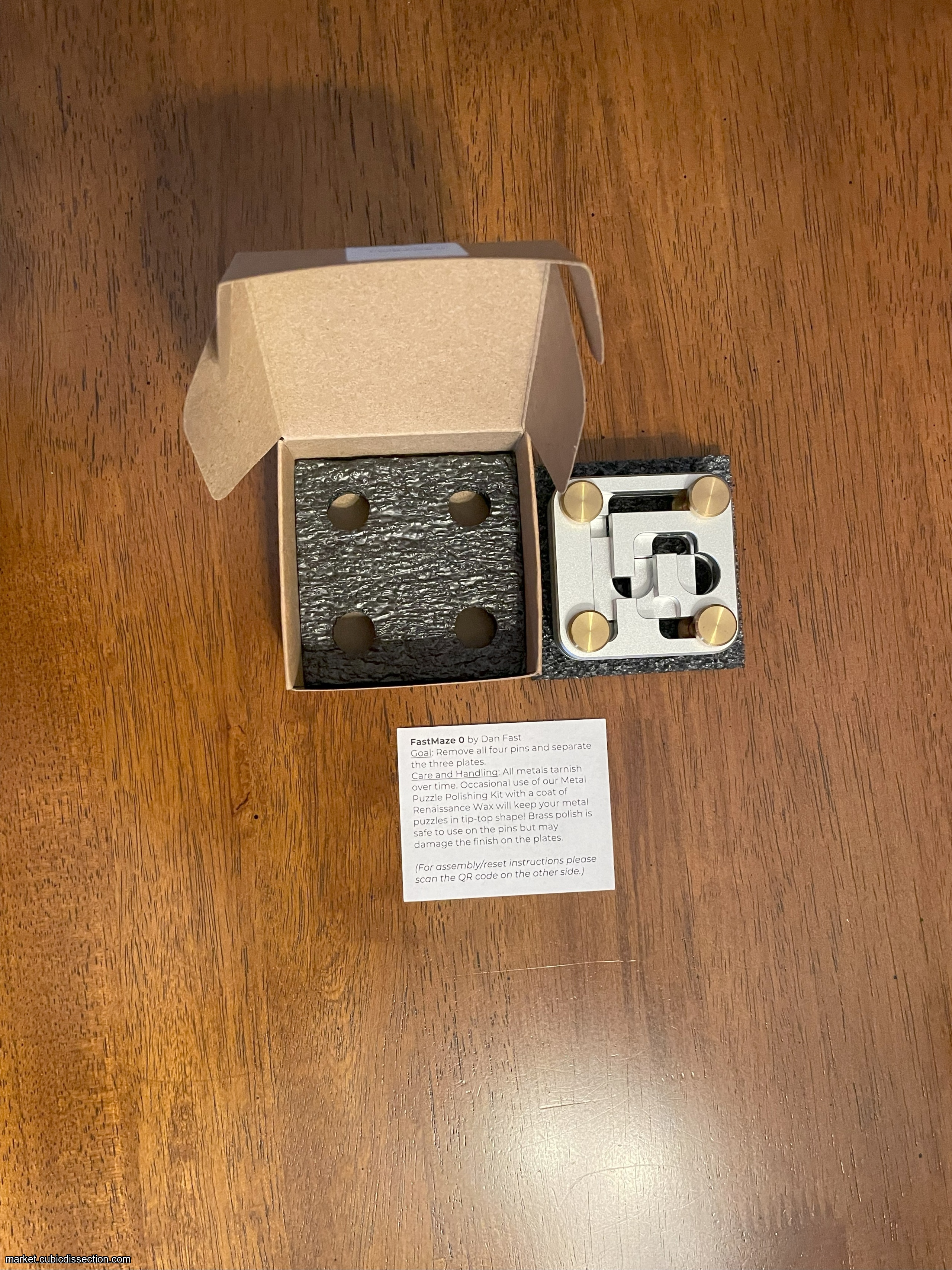 Part of designer Dan Fast's excellent series, FastMaze 0 is smaller than the other three in the collection, but it still packs a solid challenge in a pocket-sized puzzle with a level 25.23.20.6.8.11 solution requiring 94 moves to fully disassemble. Rotations are allowed and sometimes necessary, but no guarantee they will help! The brass pins unscrew for an easy reset using the included instructions should you get hopelessly lost. No force is necessary at any time.