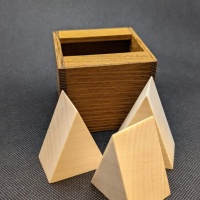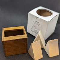 “Using the usual box that we are by now all rather familiar with, Dr Latussek has branched out into the use of not rectilinear shapes. Named after the great French mathematician, this puzzle takes 3 triangular prisms of slightly different dimensions made from Maple and asks that they be “solved” into the beautiful Acacia box. I have been playing with this on and off since they all arrived and have gotten absolutely nowhere! I can get 2 pieces inside and this can be any combination of the pieces but I have not even come close to getting the third in with them. I think that just possibly, maybe, if I am not delusional that I might have worked out where they all need to go for the final solution but there is just no way that I can achieve it. I hope that maybe someone can send me a clue once others have managed to solve it.”