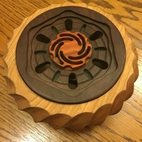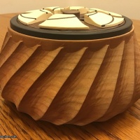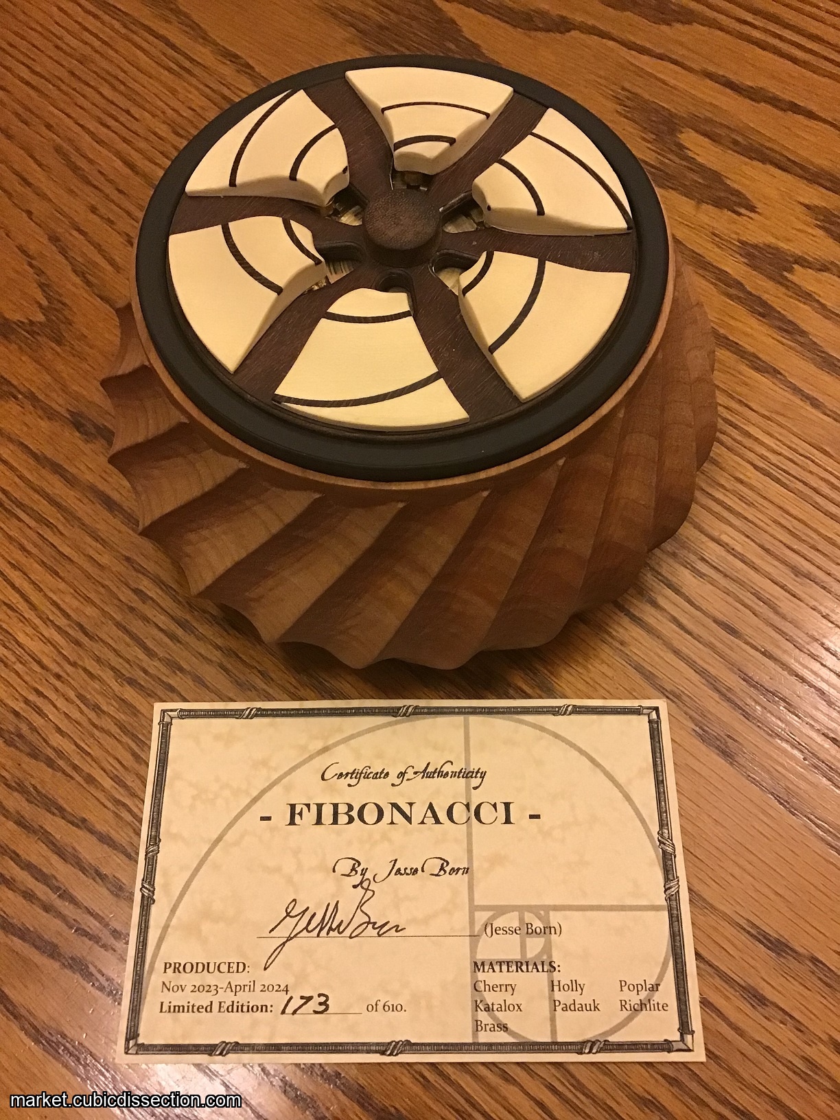 From the original listing: "The Fibonacci puzzle is based on the Fibonacci sequence found in nature. The goal of this puzzle is to open the box. I uncovered a satisfying coincidence in nature that made the basis for the main Fibonacci mechanism. When I figured out a puzzle like this could exist I knew I would eventually have to make it, and I'm very glad I did. This puzzle works very similar to the Pi puzzlebox I designed seven years ago although I'd like to think our execution is a little better this time around.