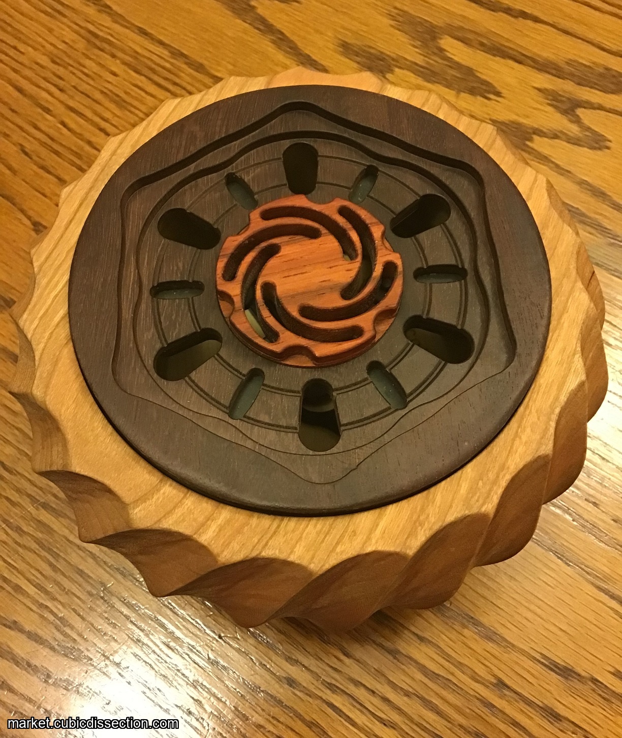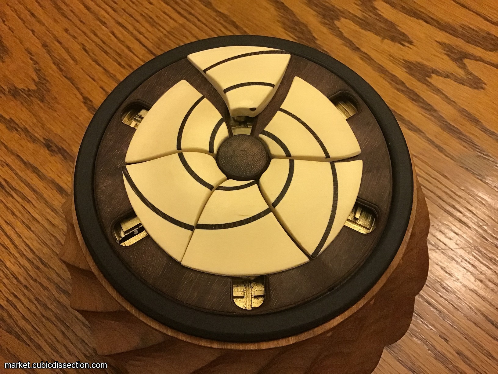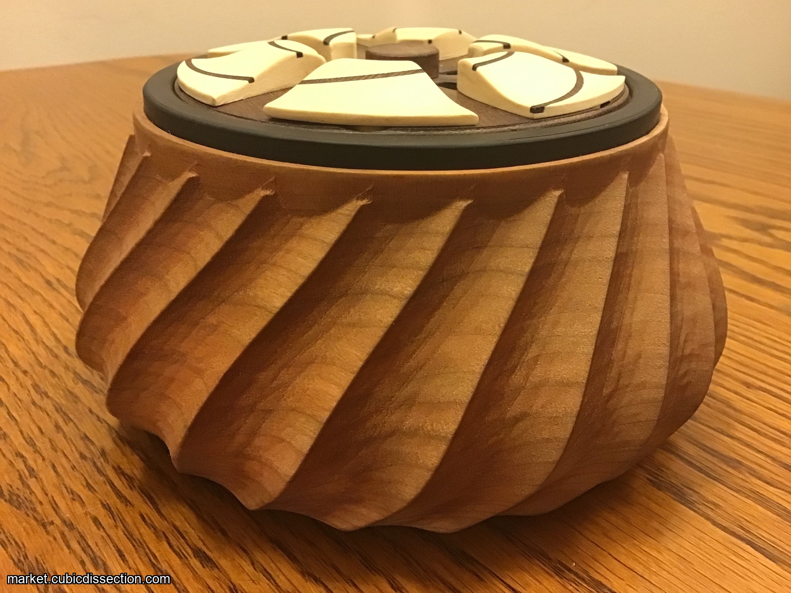 The inlay spirals on top of the puzzle are Fibonacci spirals, otherwise known as golden spirals."
