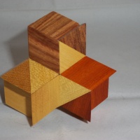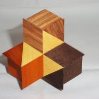 Stewart Coffin's Four Corners Puzzle (STC #6), made of Canarywood, Yellowheart, Chakte Viga, and Peruvian Walnut. Centers made from Yellowheart. Each puzzle piece consists of a six sided center block and with a prism block attached to each end. The prism blocks are in four contrasting fancy woods, combined in all 6 possible permutations. Different coloring patterns are possible in the assembled puzzle. Signed on the inside of the puzzle by me.