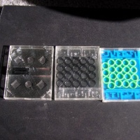 These three plastic puzzles (two are duplicates with different coloring) were from a series of 12 dexterity puzzles made by Pussy in Germany. One of the three has a picture of all 12 puzzles on the back of the puzzle, numbers 2501-2506 and 2224,26,27,29,30 and 2232. Judging by the gaps in the numbering, there may have been more. Anyway, this is only 2 of them (with 1 duplicate), numbers 2227 (2) "Point" and 2505 "Corner". Clear plastic on top is a bit scratched up, hard to see in the photo. These are about 2.5x3.5" and about 1/4" thick.