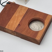 Background Information: This puzzle was the 2003 Turner Christmas Puzzle with about 100 made. Most went to family (like this one) and friends, but a few have made it out to the puzzle community. There are four components and three separate puzzles needing to be solved to get to the coin.