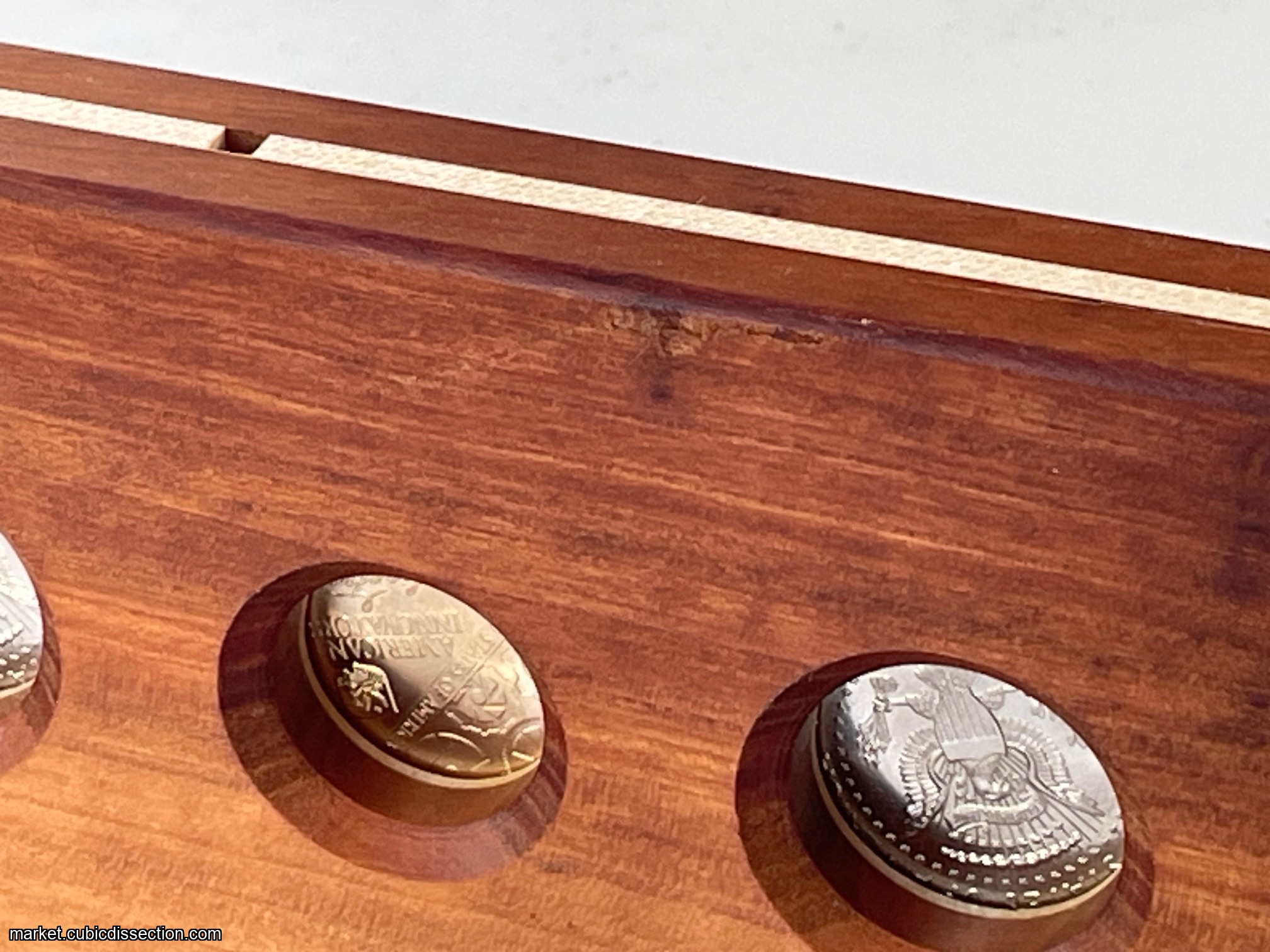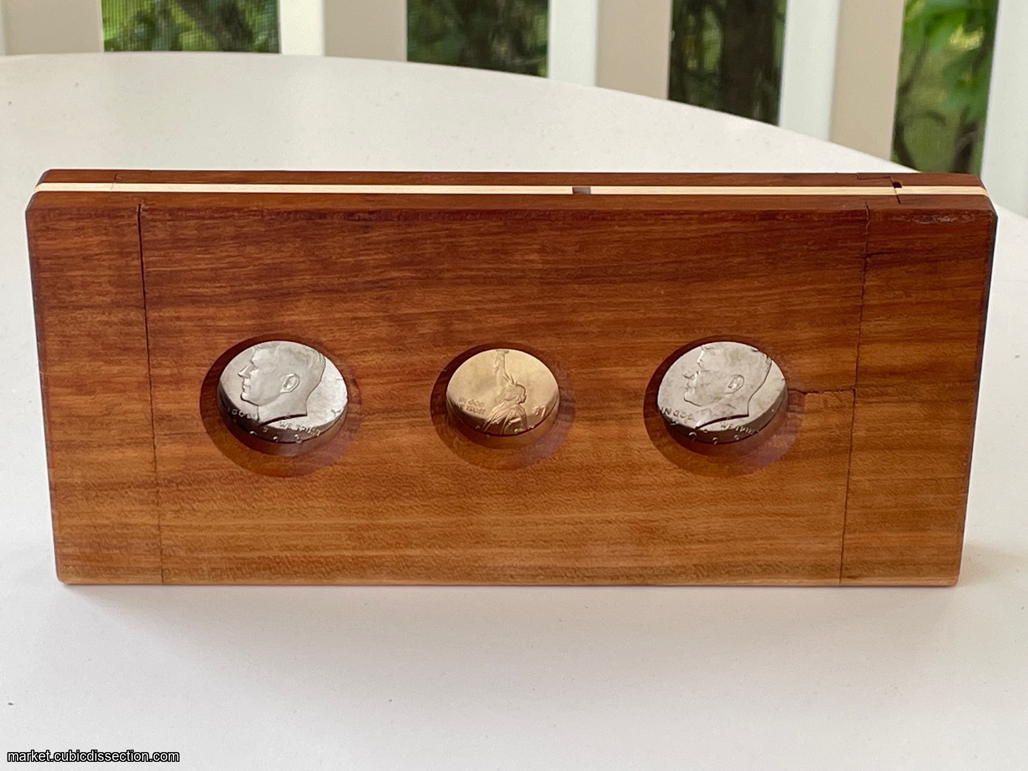 Selling my brother Stu’s Free Me puzzle series collection. As with all the Free Me puzzles, the goal is to remove the Kennedy Half Dollar coin. As it turns out, in this case there are not only two Kennedy Half Dollar coins, but also an Innovation coin (with the Statue of Liberty on the reverse). Thus, the puzzle’s nickname.