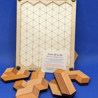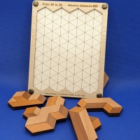 From 3D to 2D is a tray packing puzzle designed by Mitsuhiro Odawara and crafted by MINE. The goal is to put the 9 pieces into the tray with the grain directions aligned.