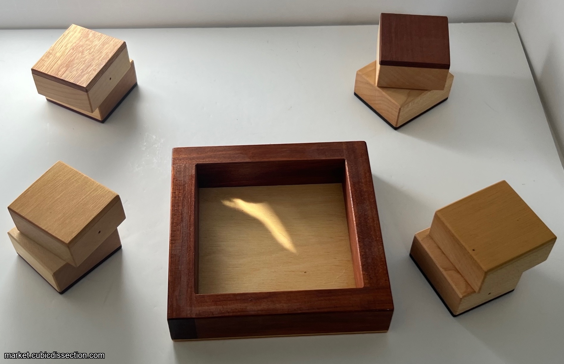 "There are 8 rectangular pieces that are connected into pairs to form 4 funny cubes. The connection allows them rotate against each other. The objective is to place the pieces into a square frame, the bottom half in the frame and the top half above the frame. Both top and bottom are to form a square. The photographs shows the top and bottom views of the four Funny Cubes. (I used pieces from 2 puzzles to show tops and bottoms. But which is the top and which is the bottom?) The woods that I used from left to right are Bubinga, Holly, Indian Rosewood, Purpleheart, Honduran Rosewood, Canarywood, Yellowheart and Peruvian Walnut."