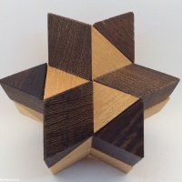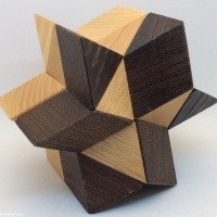 This puzzle was designed by Stewart Coffin and crafted by father and son Jeremy and Thomas Moeller of Artifactory Puzzles and I believe it to be Fusion Confusion. It Measures approximately 4" and does not include a solution.