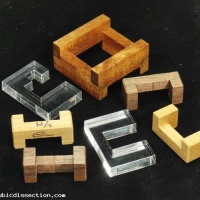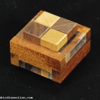 | COMMENTS: | As soon as I saw the Gaia design I knew I wanted to make it. The structure is very unique, incorporating stick pieces and board pieces with a constraining cage. The unique level 11.2 solution is not as difficult as you would think, making this a fairly approachable puzzle. When solved the acrylic nicely sets off the three wood combination. Fit is very precise, and the cage features rabbited joinery for strength. Stick pieces are milled from solid wood. 50 copies made for sale, each signed and dated. |