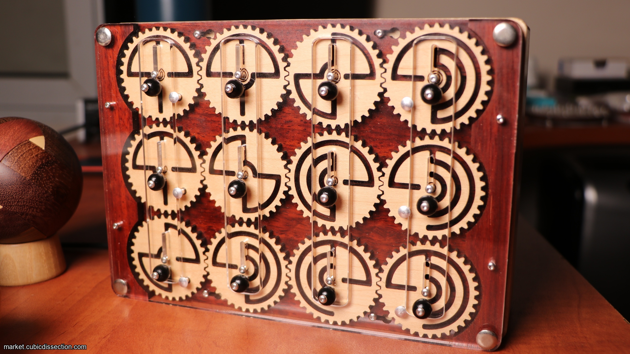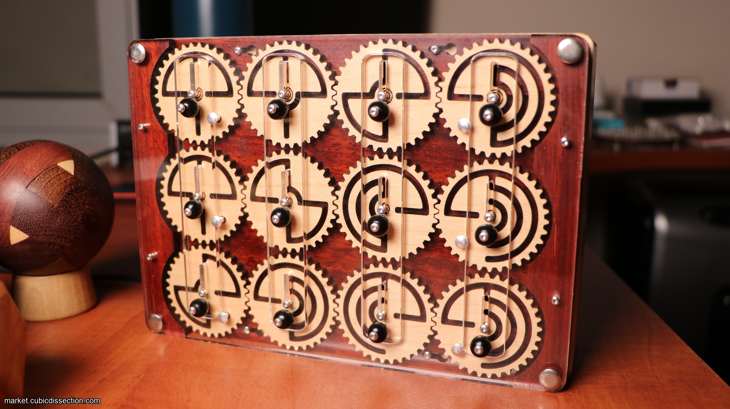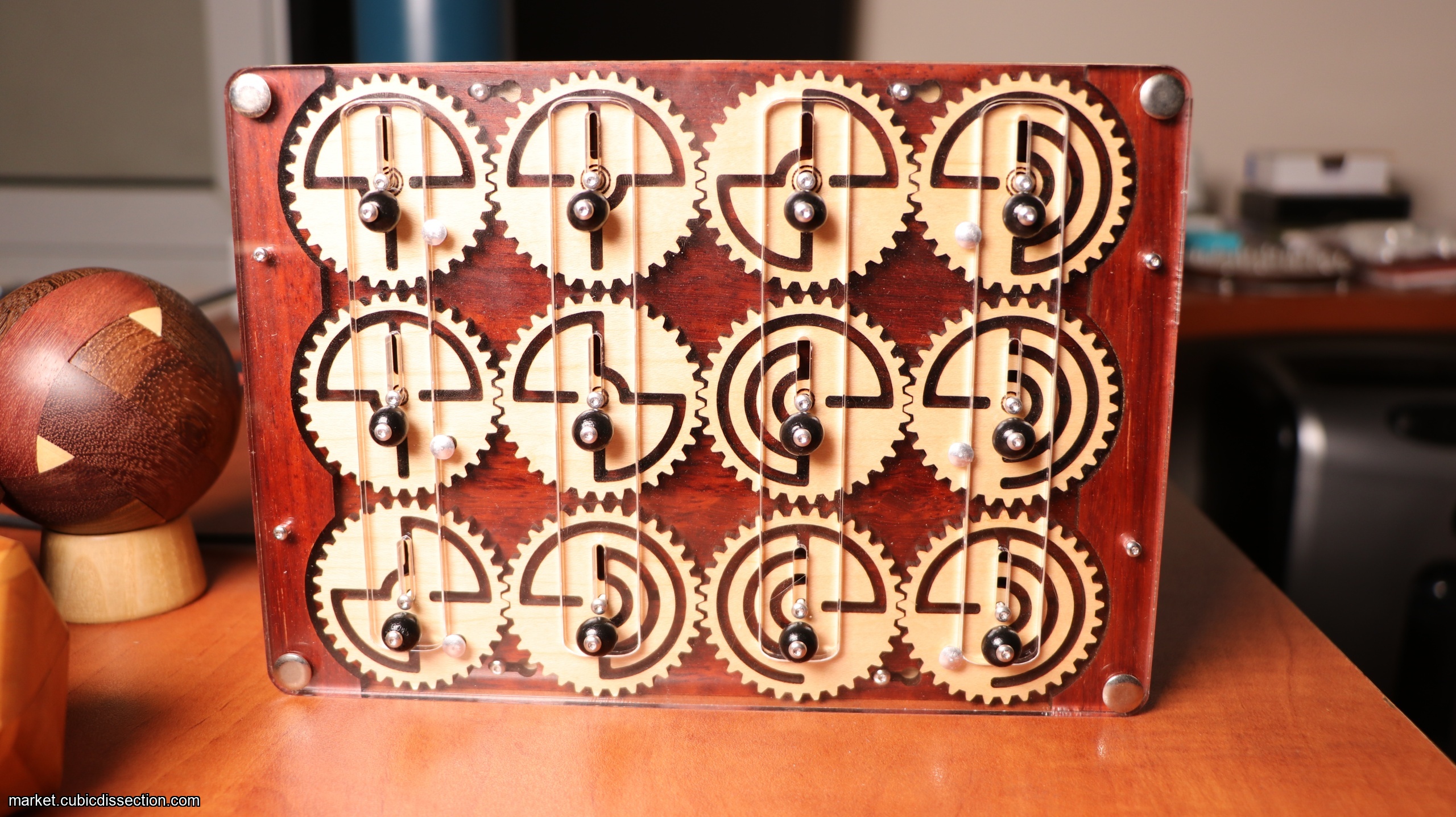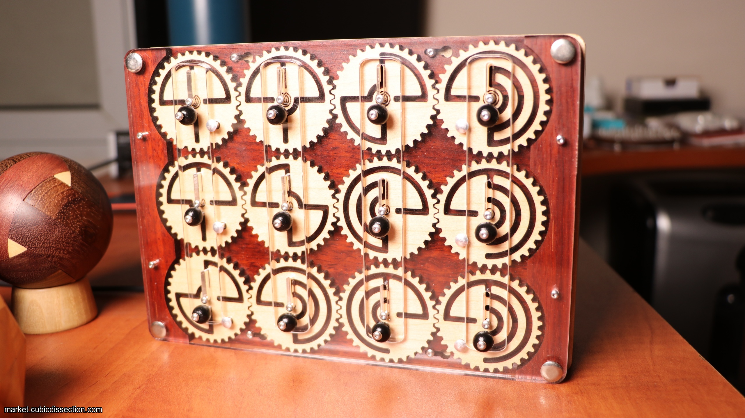 Crazy Puzzle Box by JCC. Complicated n-ary mechanism with 3 rows of 4 gears.