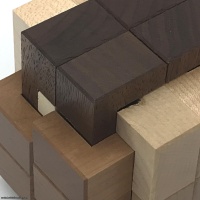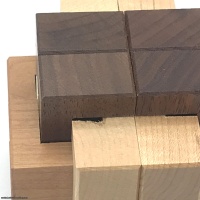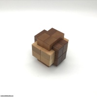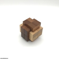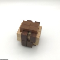 This burr leads us out of the zoo on an expedition into the famous and big Asian desert "Gobi". Although it only has 12 pieces (plus two extra special ones) and a moderate level of 31, it kept me busy for some time and after some time I was feeling like I was lost in the desert eager to come out again. In this puzzle I found the real reasons for the name of the puzzle: A nice camel piece (with double hump) and a desert dwelling nomad. To find these pieces, you will have to remove a couple of pieces. The first piece will take 31 moves, and some of them are very well hidden. For some moves, you will have to move what feels like half of the puzzle, just to reverse most of the moves later again. At these early moves, it seemed to me that someone was shadowing me during some moves — maybe a native desert inhabitant? Like going in circles in the desert trying to find the way out, I returned almost to the starting configuration of the puzzle, just to head for a different direction, and then the first encounter with the nomad! Being familiar with the "Rat trap" puzzle by Alfons, I decided to use a pencil for support. Had to hit that nomad with a stick to get him out of the way to continue! Just the camel did what these animals seem to prefer: Stubbornly lying in place and not moving at all! Later on, I found out that the nomad can also be moved by tilting and shaking the puzzle, but still he will have to move on his own. A few steps later, there he was again, obstructing my way. This time I knew what to do and a few moves later the first piece came out, as usual the one with the signature on it. That has been the hardest part of the expedition into the Gobi. The next nine moves for the second piece required some creative moves, but followed rather easily. Seems that you only have to adapt to this desert environment a bit!