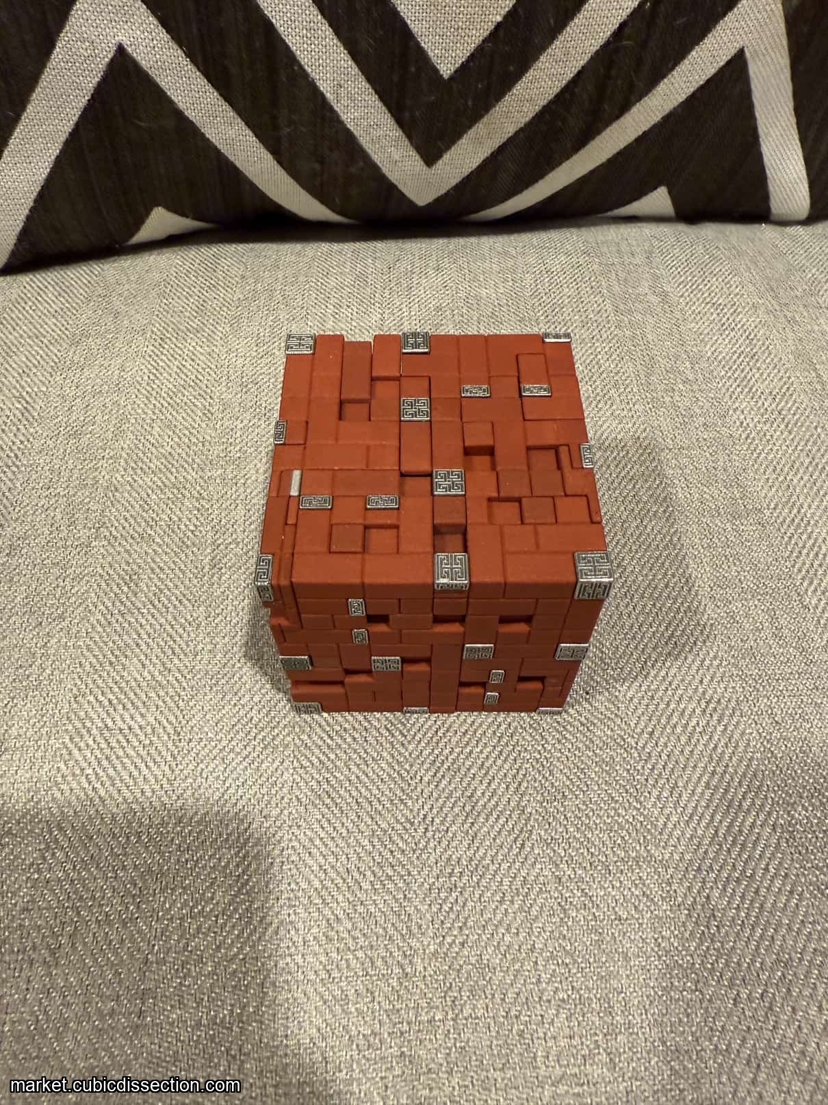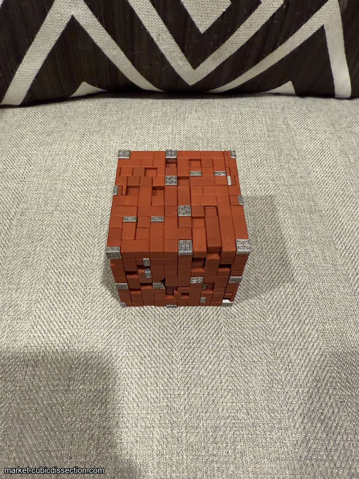 The Puzzle is Vacuum cast polyurethane resin with cast Tin alloy accent pieces with detailed Greek patterns to reflect the myth its name is based on. Keeping to the original size of 7.6cm cubed. it weighs 0.5 KG.
