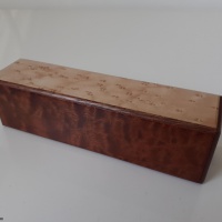 This box is milled from solid quartersawn sapele panels for stability. All six outer panels are veneered...four with quilted sapele and the top and bottom with other contrasting exotics. The extra veneer took a lot of time! Fit is god, snug but not too tight. May tighten up in humid weather (like any puzzle box) so I recommend keeping it in a climate controlled environment.