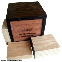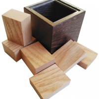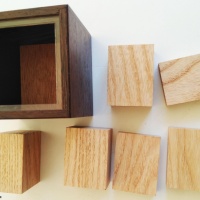A wooden box with a restricted opening on top and six pieces in 2 different sizes. Can you put all pieces into the box? This puzzle was invented by Dr. Volker Latussek (Germany) and was planned as IPP-40 exchange puzzle for Jerusalem. Made by Yavuz Demirhan.