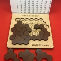 Hexagon puzzle calendar designed by Itacho and made by Osho. Solve it everyday. Includes a sheet with the number of solutions per day.