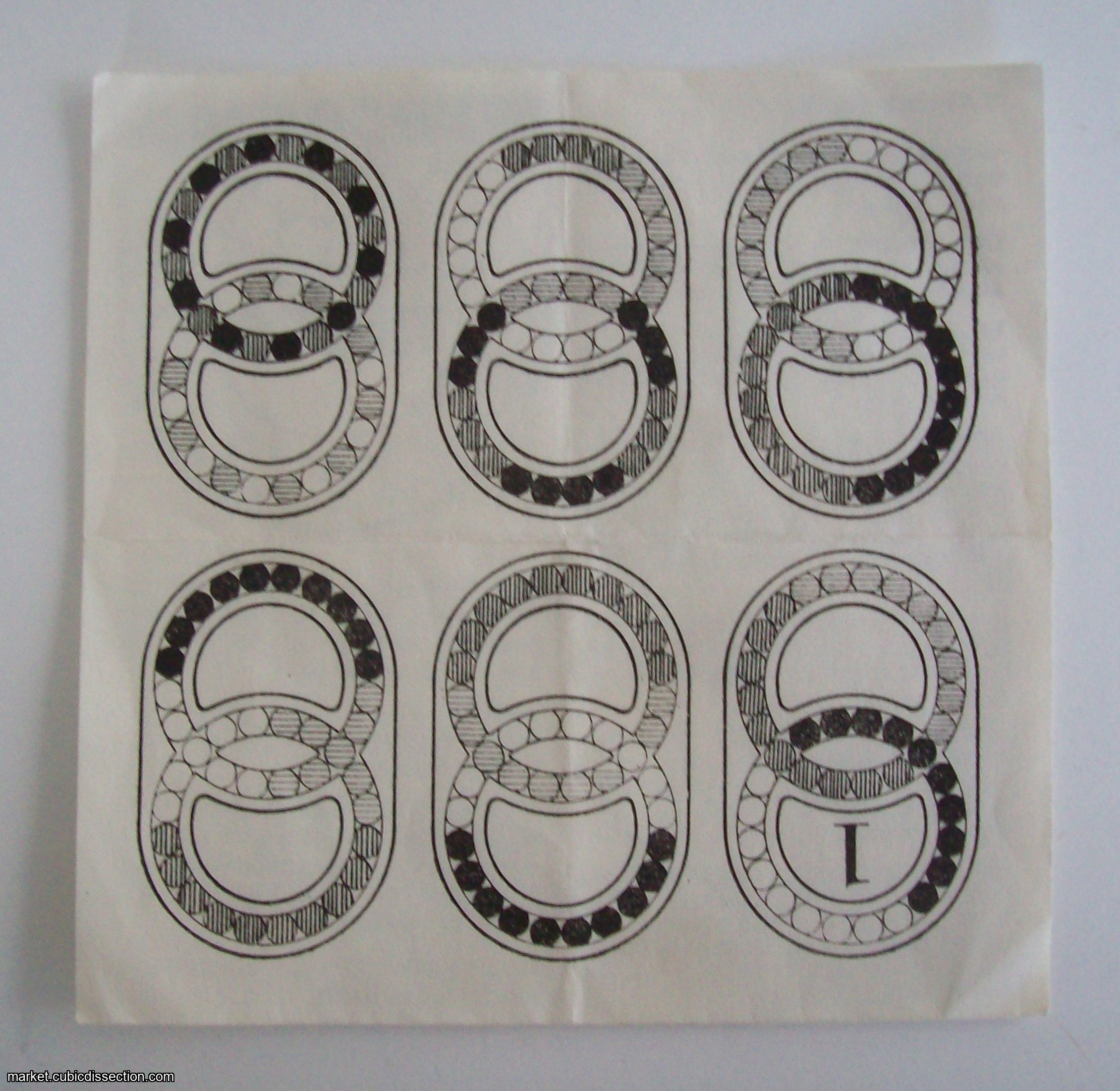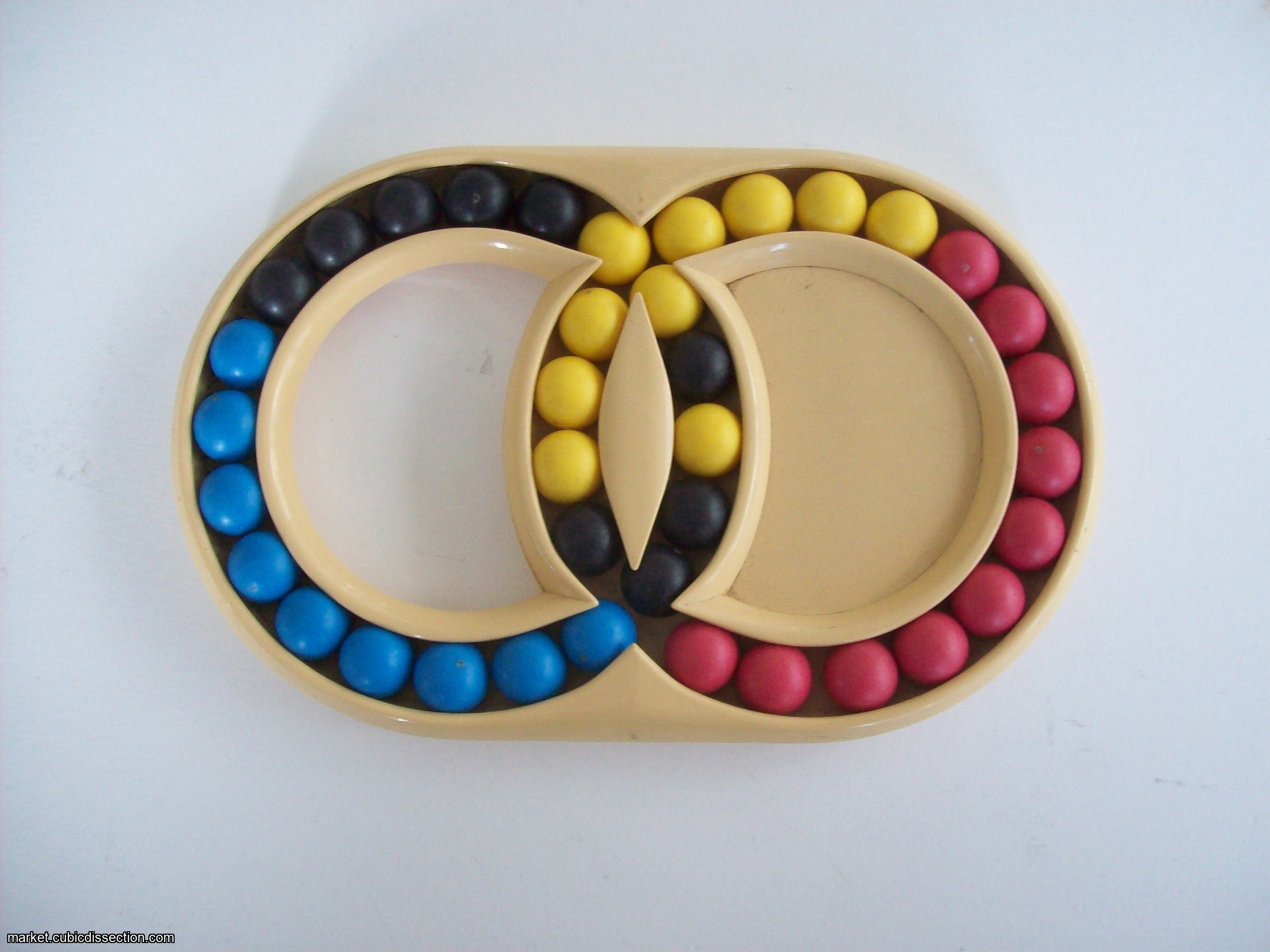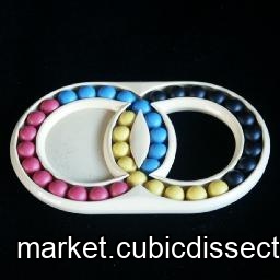 This puzzle consists of two intersecting rings, consisting of a number of colored balls. The rings of balls intersect in two places, thus sharing two balls. Each ring of balls can be rotated, so that the balls can be mixed.