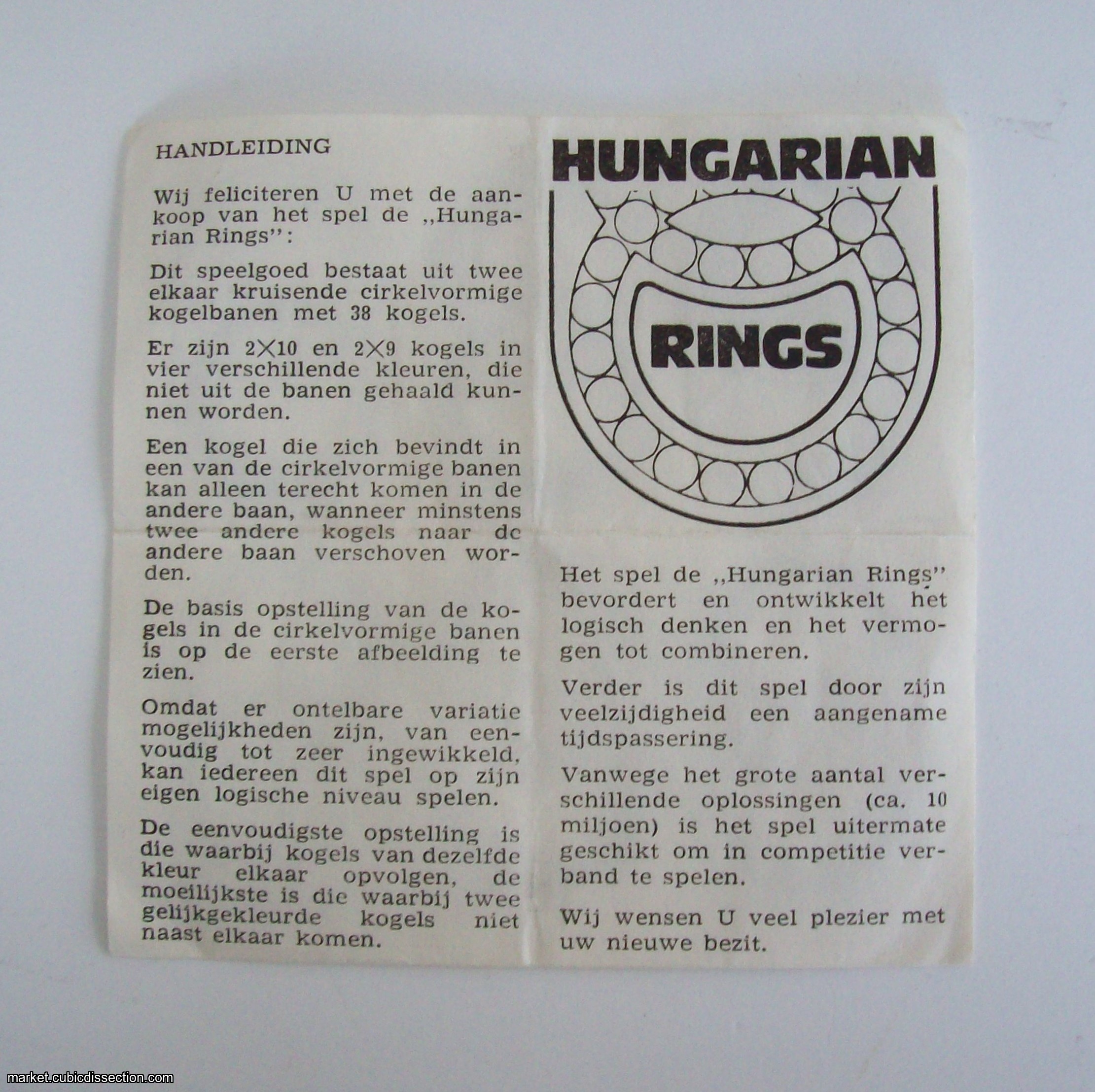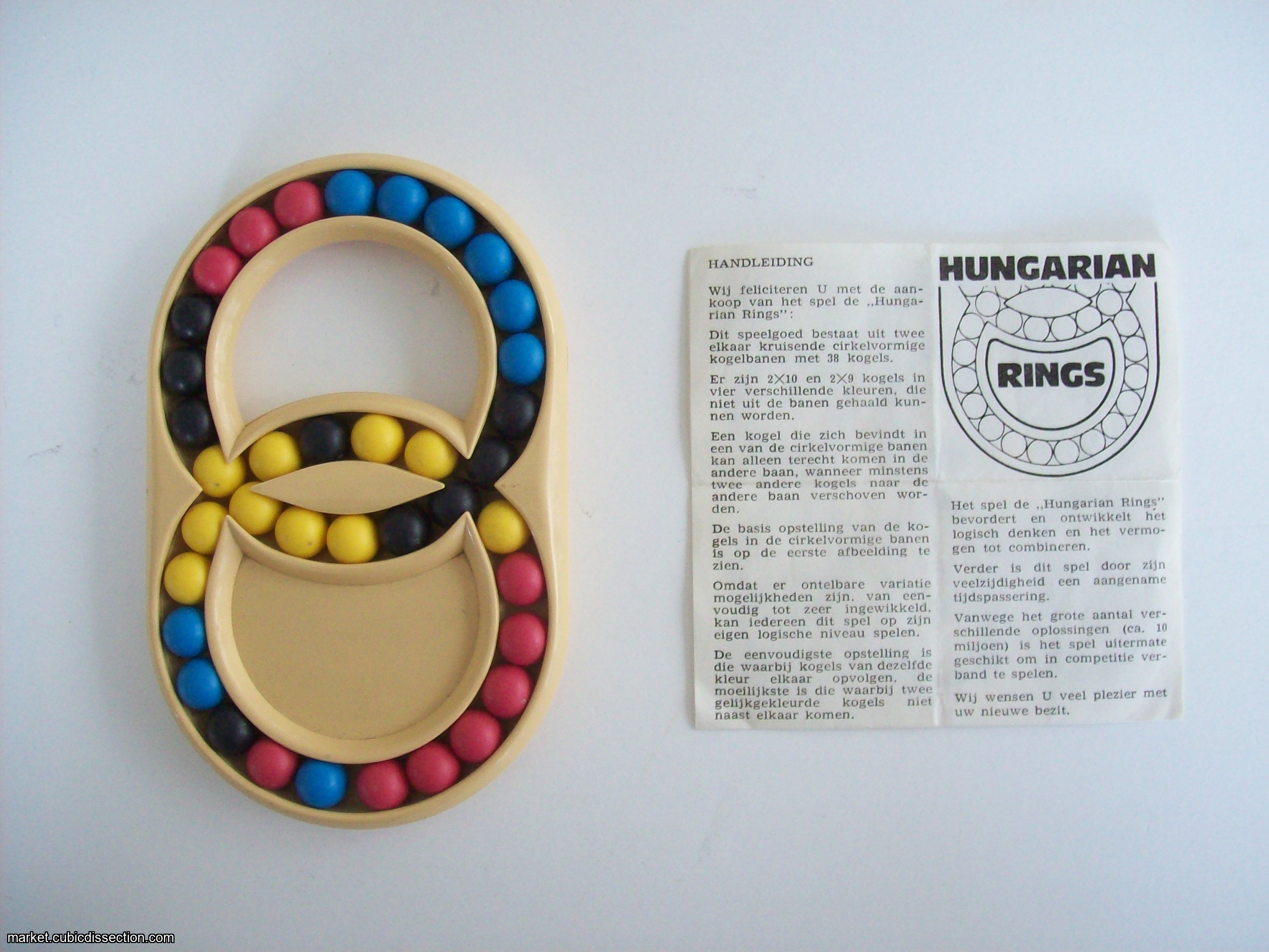 The Hungarian ring puzzle consists of 38 balls of four colors, with the intersections 5 apart (so with 4 balls in between). Two colors have 9 balls (blue and black) and two colors have 10 balls (red and yellow). After solving, the balls of each color must form a continuous row.