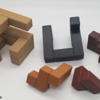 This is a new puzzle I just printed in order see if there is interest in wood infused PLA printed TICs. It has 5 Pieces, 4 moves to free the first piece, and 17 total moves including 6 rotations.