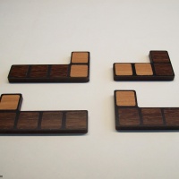 Arrange the four L-shaped pieces (two pentominoes and two tetrominoes) to fotm two 9-ominoes, one in each colour, with have identical or mirror-image shapes. There are two solutions.