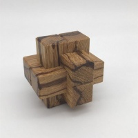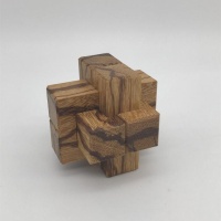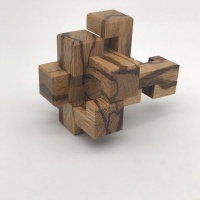It's not easy to come up with a new variation on the traditional six piece burr, but Juno came up with a great one! Because pairs of two pieces are off-centered, the assembled shape of the puzzle looks inaccurate though the pieces need to be accurate. The puzzle is based on one of the notchable sets of a level 9 combination. Thanks to the off-centered pieces the puzzle has unique solution and is very confusing to assemble!
