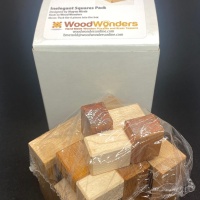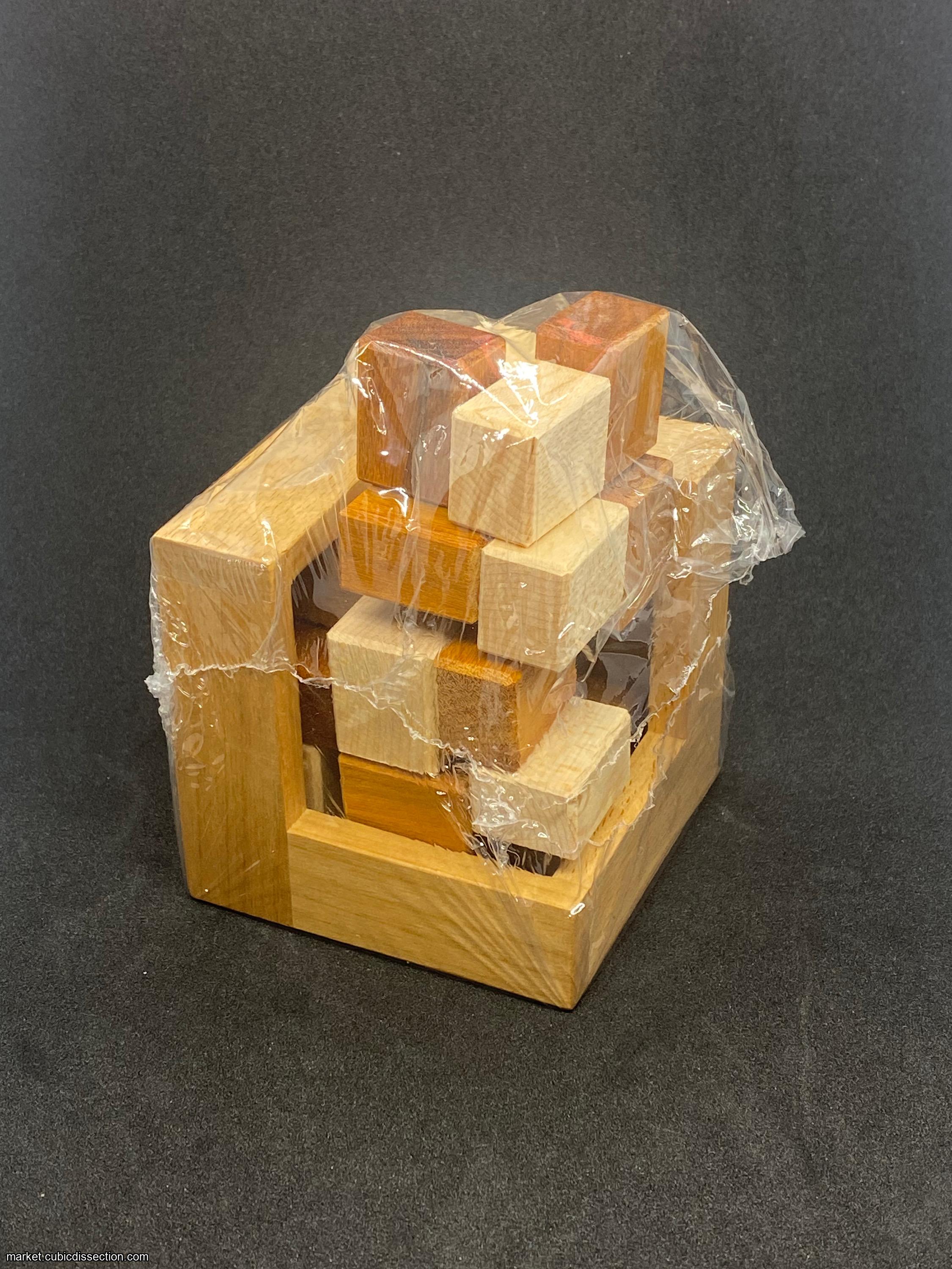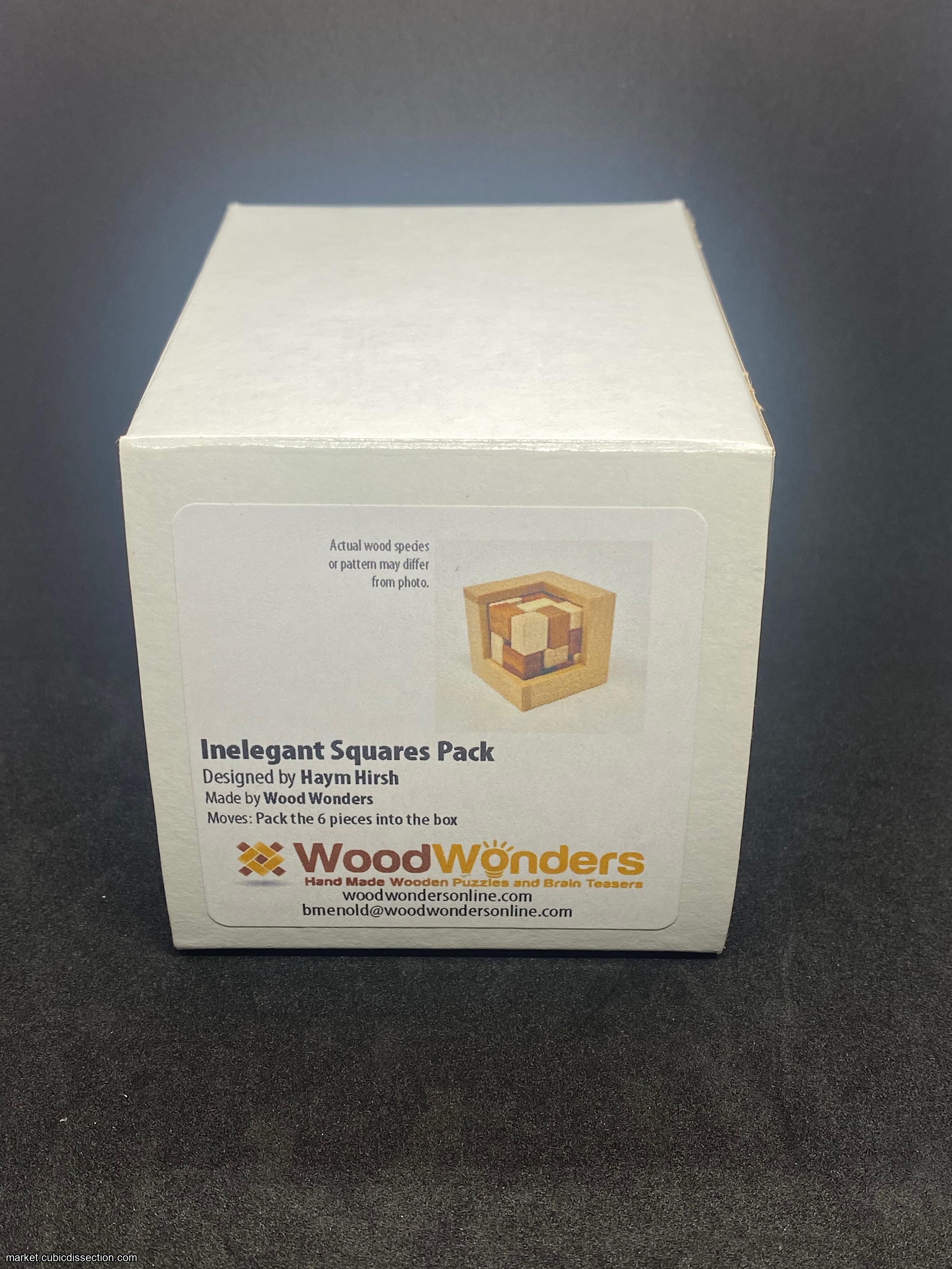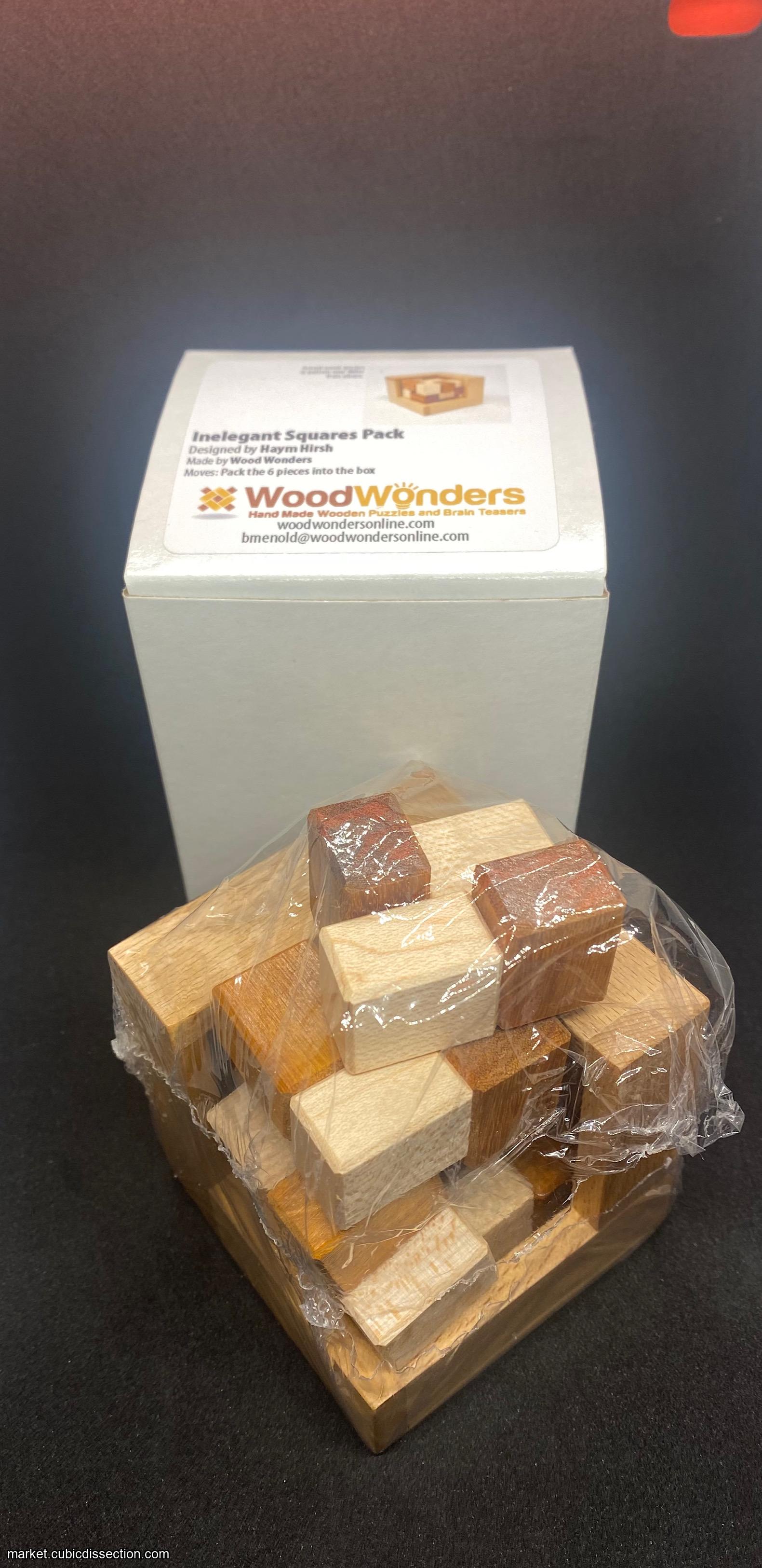 Inelegant Squares Pack puzzle by Haym Hirsh. Crafted by Woodwonders. Pack the 6 pieces into the box. I accidentally bought 2 of these. The puzzle is brand new and never solved.