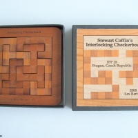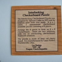 This Interlocking Checkerboard Puzzle was designed by Stewart Coffin in 1973 and he believes that none were ever made. He graciously gave me permission to use his design.
