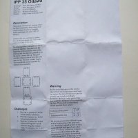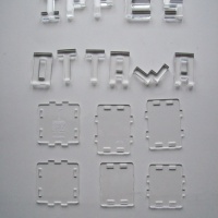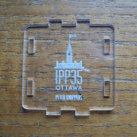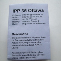 This puzzle consists of 11 pieces, lasercut from (nominally) 8mm thick clear Acrylic sheet, the pieces resemble letters and digits and spell ÏPP 35 Ottawa”.