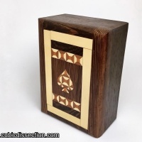 Beautifully crafted puzzle box of wenge, Holly, and various inlays. Once solved you will find a deck of cards inside. He made 100 of these now sold out puzzles, this puzzle box is numbered 18.