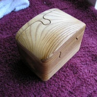 This is a nice-looking jigsaw-cut 3 piece storage box, the interior felt-lined. I bought this from "Nidderdale Boxes" in North Yorkshire, England about 11 years ago, and was made by them. The fit is rather loose, since the kerf on the jigsaw cut was pretty big, but the wood used is very interesting. Weight is 6 ounces.