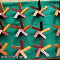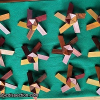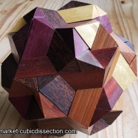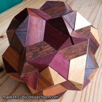 Jupiter is 12 identical pieces which assemble to make a hollow ball, the inside of which is a triacontahedron. In one colour the assembly is easy but in six different woods making each piece different, a little more thought is needed to match the colours. The woods are: yellowheart, purpleheart, bloodwood, bocote, canarywood and Honduras rosewood(I think). A slight misalignment of one purpleheart stick causes a slight gap in one of the pairs, which can be seen in the pictures. The puzzle will be shipped assembled but with the colours mixed.