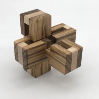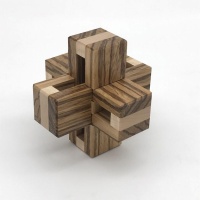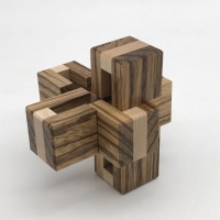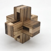 Just Three is from the brilliant mind of young prodigy Noah Prettyman. The level 8.4 solution is quite tricky for an interlocking burr with only three pieces. Beautifully crafted from milled zebrawood and maple, this puzzle looks great when solved!