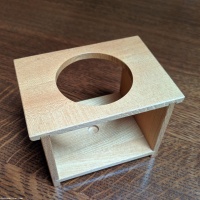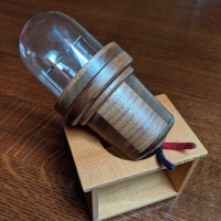 This is a work that came out from the 4th design contest. This is designed as a miniature bulb which is in a socket. If you look carefully, you will notice that the filament is cut. In this state, this Karakuri box is locked. Wooden gears are used as the mechanism. The glass (plastic) cover will not open. Which part is the real cover? And how do you open it?