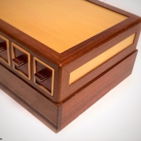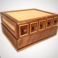 Crafted by Karakuri member Hiroshi Iwahara in 2005, this puzzle box incorporates an incredible mechanism that has the ability to remember the order in which the drawers are closed so that to open the drawers again you need to do it in the reverse order that they were closed. The puzzle box is describe by the Karakuri below.