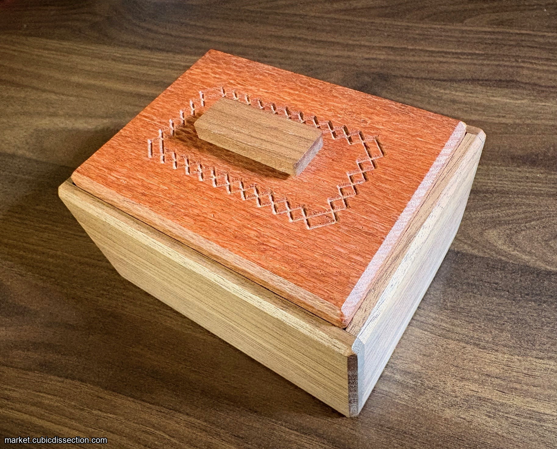 Description from https://www.dedwoodcrafts.com/products/kleeshay-box: "What started out as a simpler solve intended for beginning puzzlers ended up being much more challenging. Kleeshay Box is crafted using the rich, dark tones of superior black walnut paired beautifully with the striking leopard pattern of lacewood. It is part trick opening, part sequential discovery. Several moves are needed to solve the puzzle. Kleeshay Box measures 5" x 4" x 3"."