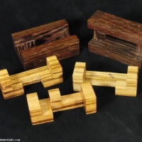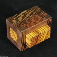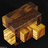 COMMENTS:La Taupe is a fairly simple puzzle with a level 9 solution but I found the shape and concept so interesting that I had to try making it. I'm glad I did, the solution is fun and more confusing than you might imagine with a mere five pieces. The contrast between the Wenge and Zebrawood is beautiful. This guy is a little gem! Construction of this puzzle is outstanding, with shouldered board construction and solid milled burr pieces. Fit is excellent. 50 copies made for sale, each signed and dated. This puzzle is shipped assembled.