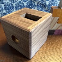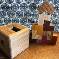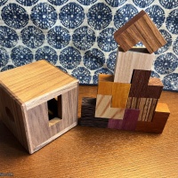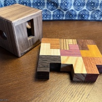 Letter Box is a very tricky packing puzzle. The 1x2 unit opening restricts the nine identical pieces which fill the 3x3x3 box. With multiple rotations and more than 50 steps, discovering the solution will keep you occupied for some time. This is an excellent design well-suited for the solver seeking a true challenge.