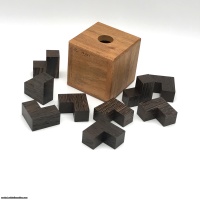 Letter Box is a very tricky packing puzzle. The 1x2 unit opening restricts the nine identical pieces which fill the 3x3x3 box. With multiple rotations and more than 50 steps, discovering the solution will keep you occupied for some time. This is an excellent design well-suited for the solver seeking a true challenge. We constructed Letter Box from some of our finest wood stock. The solid walnut box shows excellent striping and deep color. Each of the nine pieces was milled from solid stock out of a different fine or exotic wood. (Canxan, Jatoba, Ash, Zebra, Bloodwood, Purple Heart, Katalox, Chakte Viga, Wenge)
