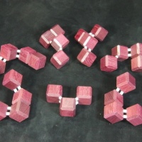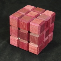 Cubicdissection.com description: "The 3x3x3 cube is pretty played out. With only 27 units there are only so many things you can do with it. That's assuming tradition block glued to blocks...if you open up edge connections, a whole new world of complexity appears! Markku's excellent Liberal Cube makes good use of these dynamics, with a very confusing and difficult seven piece serial assembly. I would estimate that the difficulty is on par with Coffin's Convolution design which of course uses a 4x4x4 design format. This puzzle is a lot of fun and displays very well with the contrasting white dowels against the dark purpleheart."