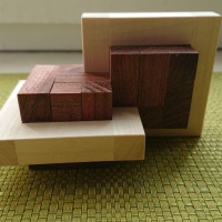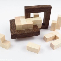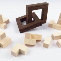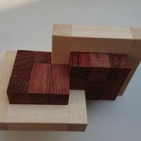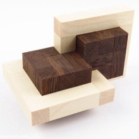 “Links D puzzle is part of a series of puzzles where 2 or more pieces are connected and cannot be taken apart but allow some movement, this movement is needed to assemble & dissamble the puzzle. The shape of this puzzle is based on 2 square 'links', and 2 cubes that fill up the links.”
