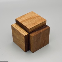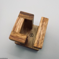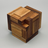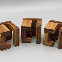 Three identical pieces must be combined into a cube shape (with some missing external voxels). Unique challenge by Bram Cohen, beautifully crafted by Tom Lensch out of Canarywood, with Tom's logo on the inside of one piece. Tom added hidden dowels each of the pieces for added strength.