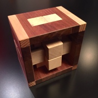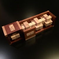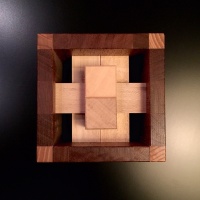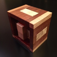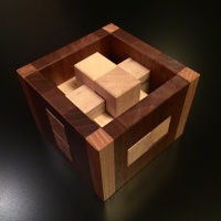 | COMMENTS: | When Logan sent me the first puzzle in this series, the Bookend puzzle, I was very impressed. The concept was interesting, the solution tricky, and of course the finished puzzle displayed very nicely. He then followed it up with three more complimentary designs, each with a unique solution. I knew immediately I wanted to make them, and so now I'm very glad to be able to share with you this series of Constrained burrs. I think this set is a unique concept and is likely to be a classic. The Bookend burr is the easiest of the set and a good place to start. With a unique level 10.4 solution it's no pushover, but the extra length added to the pieces to interact with the frame helps determine piece location and in some cases orientation. A fun puzzle and a worthy beginning to the set. The Clamped burr is a very high level 15.3.5, and is quite difficult. Because the piece lengths vary for each axis, the solver does have a significant clue as to piece location; thus the Looped burr is somewhat trickier to solve. That said the Clamped is a close second, followed by the Cornered and then the Bookend. The Cornered burr is a very high level 14, and is moderate in difficulty. Because potentially all six of the pieces can share positions it is tricky, but there is also a fair bit of loose space and I have found a couple rotational shortcuts with the potential to somewhat simplify the high level. That said, this is by no means an easy puzzle. The Looped burr is a very high level 15, and is probably the most difficult of the Constrained series. Because potentially four of the pieces can share a position it is trickier than the similar level Clamped burr. 40 copies of each made for sale, each signed and dated. Ships assembled. |