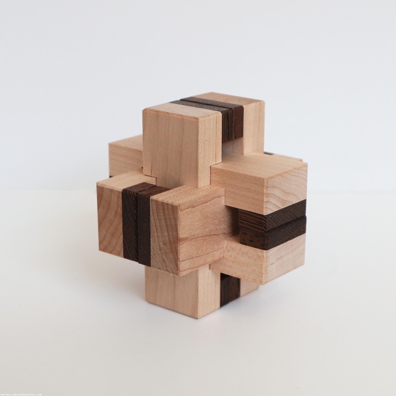 The Loopy Burr came from the genius brain of Junichi; a very unusual six piece interlocking puzzle with pieces that form three intermingled loops once in the proper position. Finding that position takes eleven moves, and is downright tricky due to the space caused by the loops. Good luck!