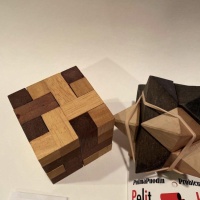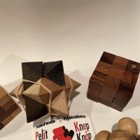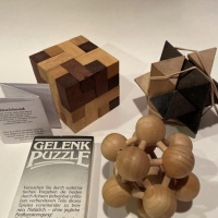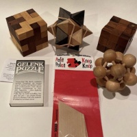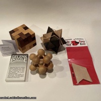 Wood puzzle lot of 7 puzzles. Blockhead is from Puzzlemaster (top left of photo). Top right is a snake cube. The rest are various puzzles which all have cosmetic issues. All are not perfect with function. Most are loose. All have been solved.