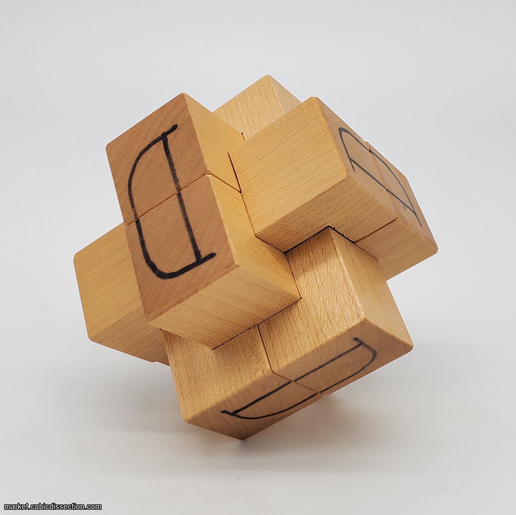 description: A six-piece burr puzzle, Love’s Dozen is notable for being the highest-level notchable 6-piece burr, requiring 12 moves to remove the first piece. Crafted in Maple, its ends are marked to enforce the level-12 solution