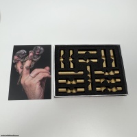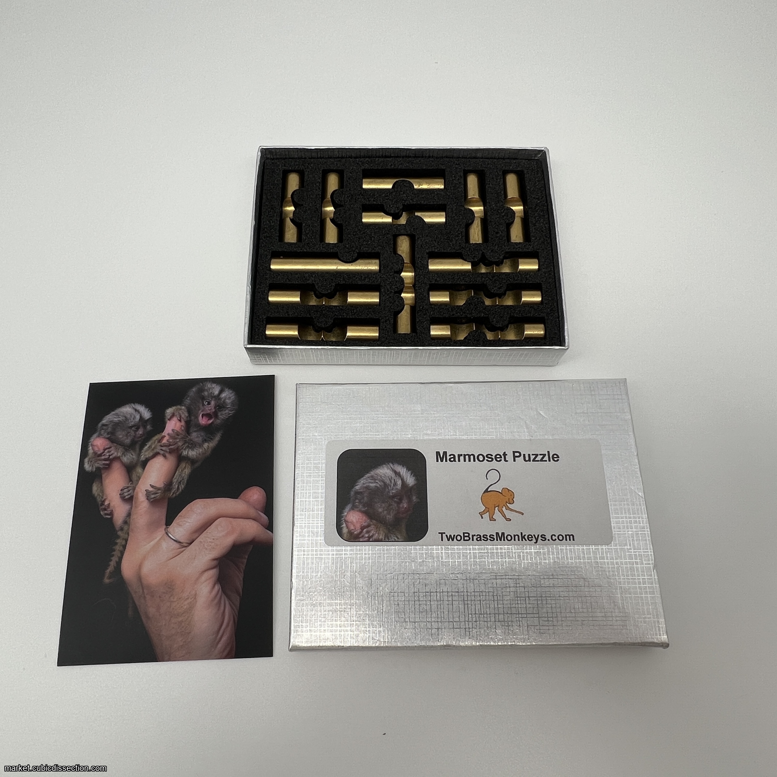 Named after the smallest monkey in the animal Kingdom, the Pygmy Marmoset, these small puzzles nonetheless feel dense and heavy when assembled thanks to their solid brass construction. Both have thirteen pieces and share an identical shape yet have very different solutions. Pygmy construction allows for a more straightforward determination of piece placement but is more challenging to assemble. Marmoset comes together with less effort but is more of a challenge to determine positioning and order. Both are difficult, and neither yields its secrets easily.