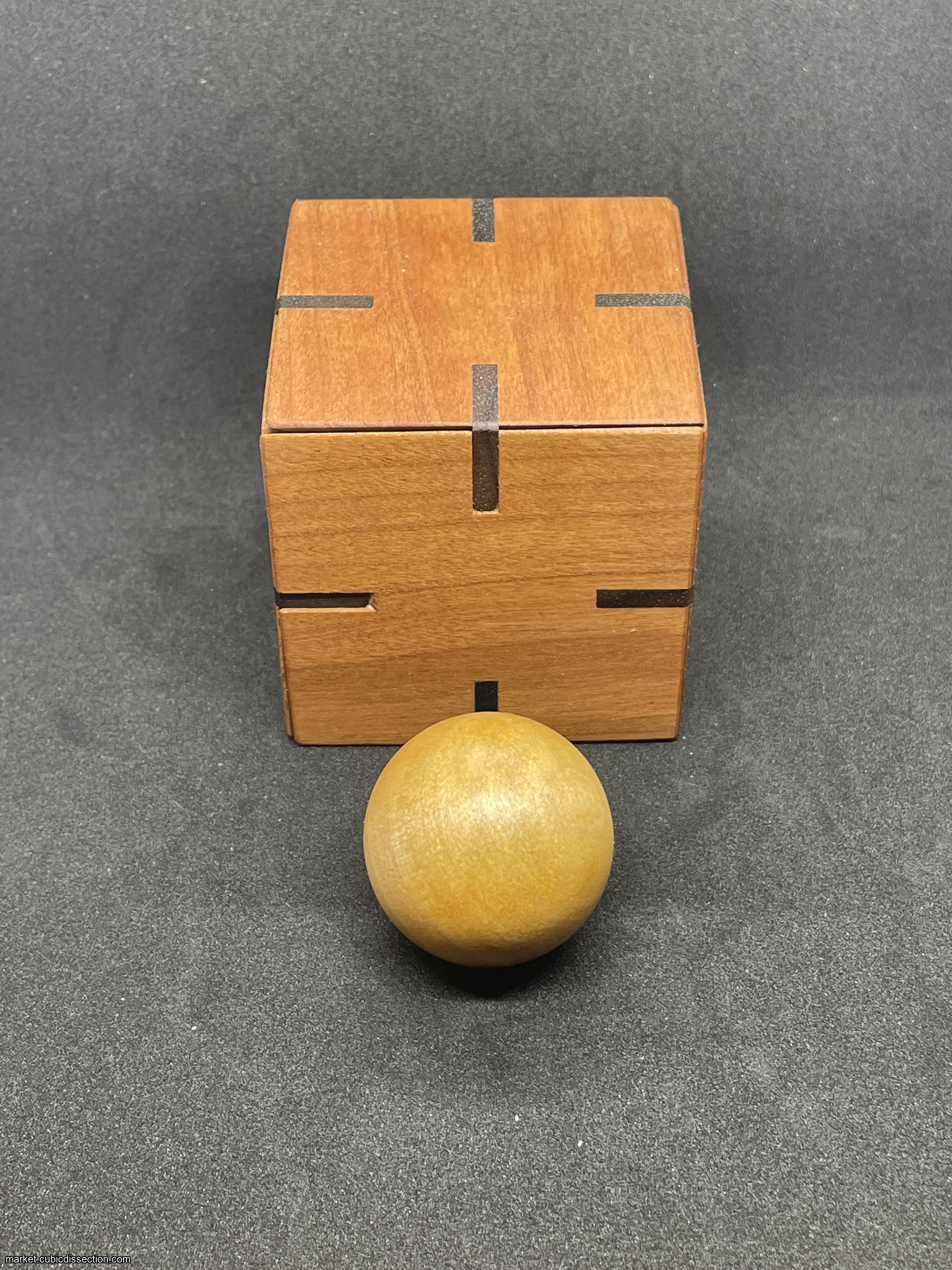 Millers Cube by George Miller and made by Tom Lensch. Put the ball in the box as you build it around it. Made of wood but I'm not sure what kind.