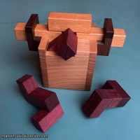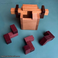 A tough packing puzzle with a fixed moving piece. Designed by the very creative Alexander Magyarics! Goal is for the hole opening to be filled with the arm in the central position.